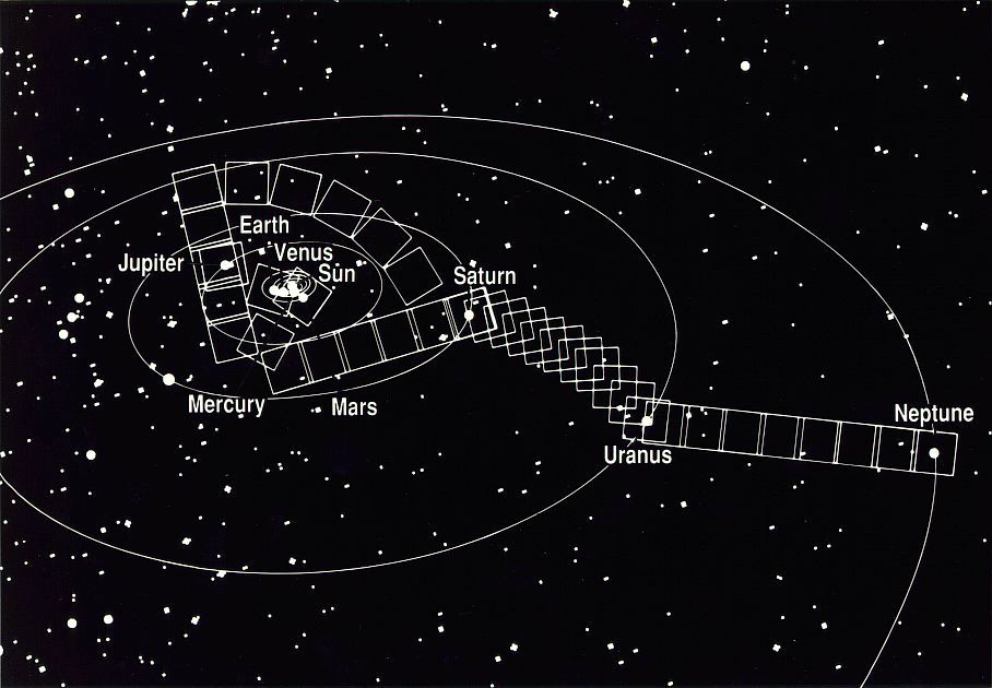 The cameras of Voyager 1 on Feb. 14, 1990, pointed back toward the sun and took a series of pictures of the sun and the planets, making the first ever “portrait” of our solar system as seen from the outside. In the course of taking this mosaic consisting of a total of 60 frames, Voyager 1 made several images of the inner solar system from a distance of approximately 4 billion miles and about 32 deqrees above the ecliptic plane. Thirty-nine wide angle frames link together six of the planets of our solar system in this mosiaic. Outermost Neptune is 30 times further from the sun than Earth. Our sun is seen as the bright object in the center of the circle of frames. The wide-angle image of the sun was taken with the camera’s darkest filter (a methane absorption band) and the shortest possible exposure (5 thousandths of a second) to avoid saturating the camera’s vidicon tube with scattered sunlight. The sun is not large as seen from Voyager, only about one-fortieth of the diameter as seen from Earth, but is still almost 8 million times brighter than the brightest star in Earth’s sky, Sirius. The result of this great brightness is an image with multiple reflections from the optics in the camera. Wide-angle images surrounding the sun also show many artifacts attributable to scattered light in the optics. These were taken through the clear filter with one second exposures. The insets show the planets magnified many times. Narrow-angle images of Earth, Venus, Jupiter, Saturn, Uranus and Neptune were acquired as the spacecraft built the wide-angle mosaic. Jupiter is larger than a narrow-angle pixel and is clearly resolved, as is Saturn with its rings. Uranus and Neptune appear larger than they really are because of image smear due to spacecraft motion during the long (15 second) exposures. From Voyager’s great distance Earth and Venus are mere points of light, less than the size of a picture element even in the narrow-angle camera. Earth was a crescent only 0.12 pixel in size. Coincidentally, Earth lies right in the center of one of the scattered light rays resulting from taking the image so close to the sun.